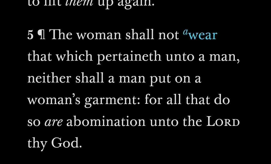 >>42602033Christians are bad at reading scripture becouse they are lazy and stupid >https://www.sefaria.org/Rashi_on_Deuteronomy.22.5>https://www.sefaria.org/Nazir.59a.3>https://www.thetorah.com/article/the-prohibition-of-cross-dressing