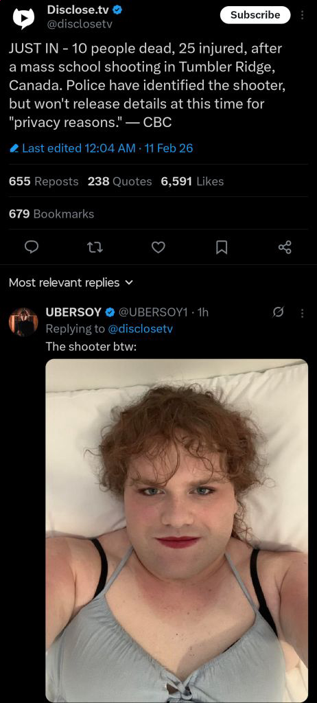 >>42629296>This isn't the right personThe person chuds are posting is located on the other side of Canada from the shooting and there is zero evidence it is them. It just some random hon who happens to live in canada.>though the actual shooter seemed to be trans?Nothing at all has indicated that.Statistically it is actually much more likely to be some pol loser.