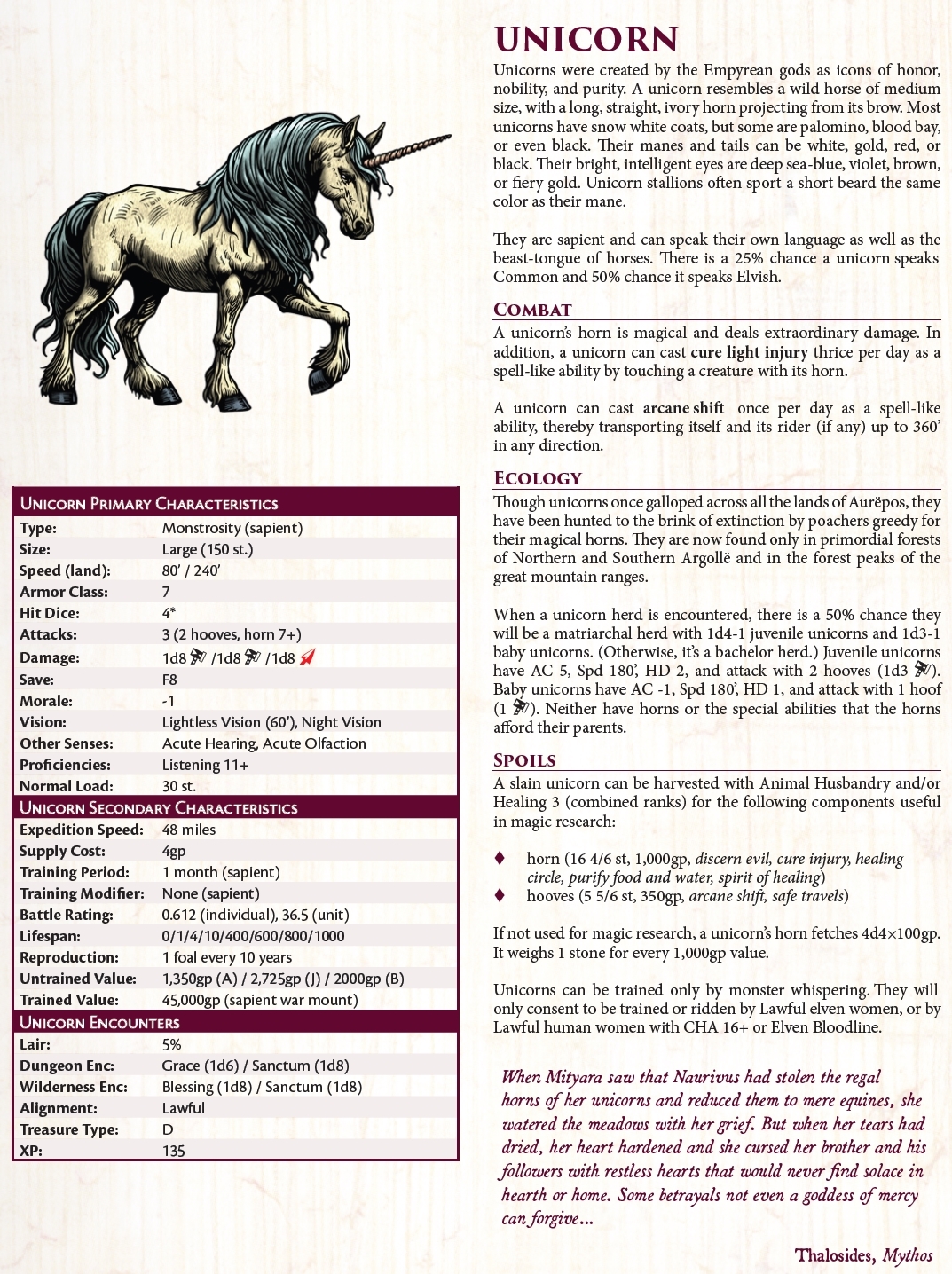 >>42701984Renting out the unicorn as a war mount would net me trained value/33 per week - 4x supply cost = 1,351 gold a week. Which is a lot. But this assumes I can find a lawful Elven woman with four ranks in animal training unicorn and pay her whispering price which is already 1,500 gold minimum. She would also need three ranks in manual of arms, a rank in mounted combat, and a rank in weapon focus bows and crossbows. That's got to raise the price astronomically. Don't know how I could get her to do any of this willingly either. If while out on loan the unicorn gets frisky I lose half of the blood sacrifice value too because evil gods are weird and pay double for virgins so I would need to be extra mindful of preventing that. It's also super dangerous to rent the unicorn as a war mount because it could die.