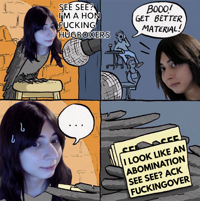 >>42731174???it's just my buttit's literally flat and hank hill-tier>>42731036idk who that is>>42731219>we just need to do it in dignity"no"if i have to suffer being a hon then i'm going to make it everyone else's problem>also stop posting distorted pics, they don't go into my collection ;___;???