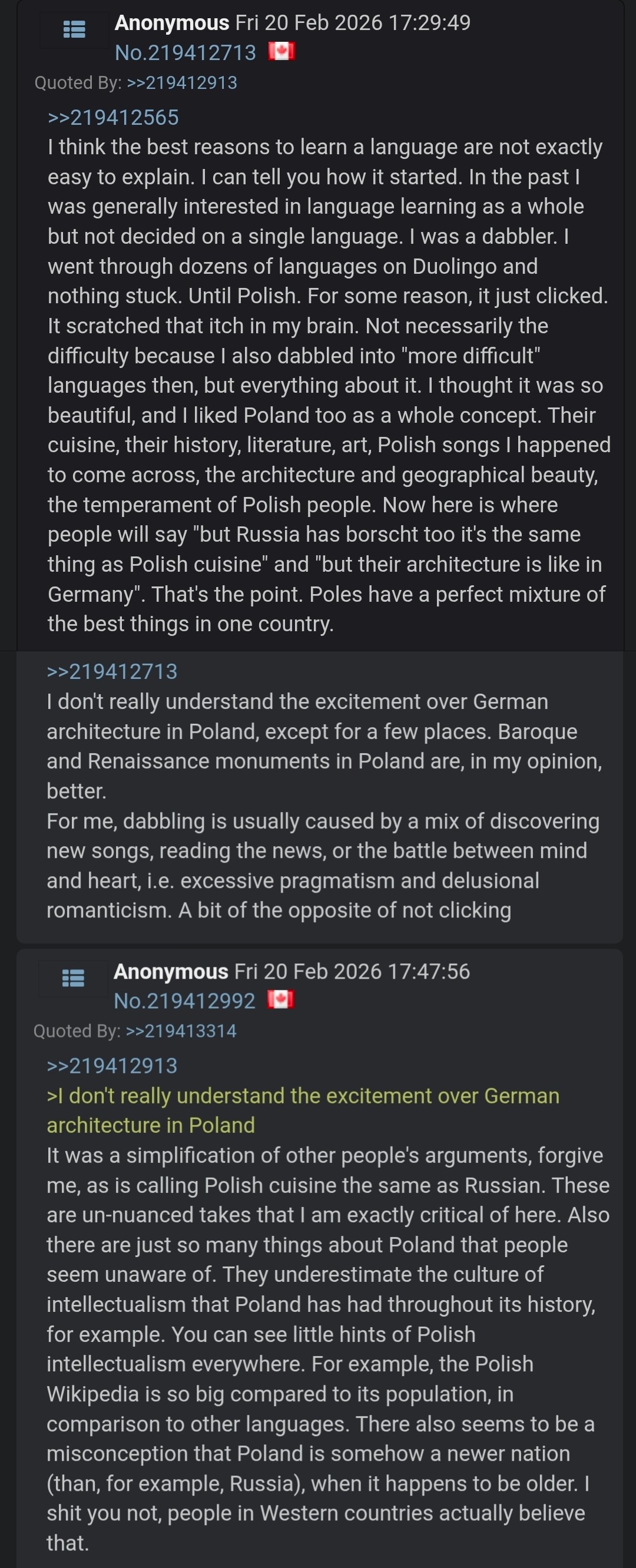 >>42757383Często zadawane mi jest to pytanie, a trudno mi wyjaśniać to, ehh? Czasami myślę o napisaniu na to jakieś wielkie wypracowanie czy coś, oczywiście po polsku. Chyba byłem Polakiem w przeszłym życiu. Postuję wszystkie posty po polsku bez pomocy ani słownika, więc widać, że długo uczyłem się polskiego.