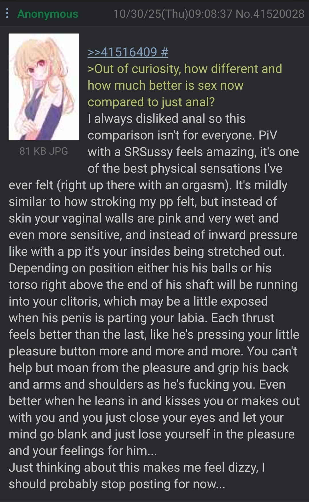 >>42744472In Soviet Russia AGP gets rid of You!>>42744734oooh. you seem to see women as some sort of alien creatures dont you? few years and it will go from wanting to be (turned into)) girl (even if its just for horny for you now) to feeling like your woman piloting malebody. feeling trapped screaming to get free. shit you not its downward spiral waves of alternate longing, hyperfocused distraction, dissociation, despair, delusional reemission while being dead despite being alive... with exceptions of sweet divine monents of that girlfeel, longing and calling. you will see. we warn you. buckle up ride just begun (hysterical repper laugh) and it will be neverending my dear. oh dear its for real hahaha.>>42744779bisexual? fetish? like started with fapping to traps and transes then putting on frocks started to seem very alluring and thought of putting them on and getting fucked by a man gives you horny even though gay porn does nothing to you, eh?>>42745005true but after years even thisbstops working nor drugs. wqking up in the middle of night anxious calming down by submerging yourself in a calm soothing imaginery of being a woman to be crushed by longing and crying... >>42745106dont be fooled. when lust wanes spiritual agp shines so bright. it does.also need to add... if your family is religious its trauma that caused you to repress deeply but it resurfaced as soon as you unfetrered yoursellf from that and tradchud nonsense and got exposed to it. like a fly in a honeypot.