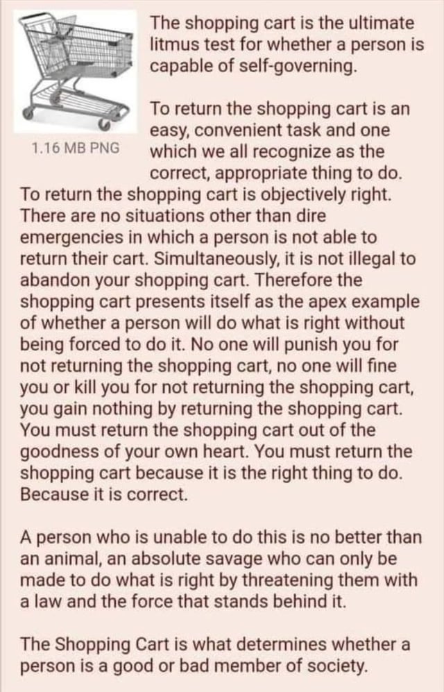 >>42750566>>42750590i just thought it was an interesting thought experiment of a task that you will face no punishment for failing to complete but should perform regardless out of a basic consideration for those around you. i didn't know it was like a constant problem like there's people who steal shopping carts here because they're useful to carry things or to ride in but I think I've only seen them lying around in supermarket car parks like you describe a handful of times. and it can't even be a rich people thing I've lived in a lot of places