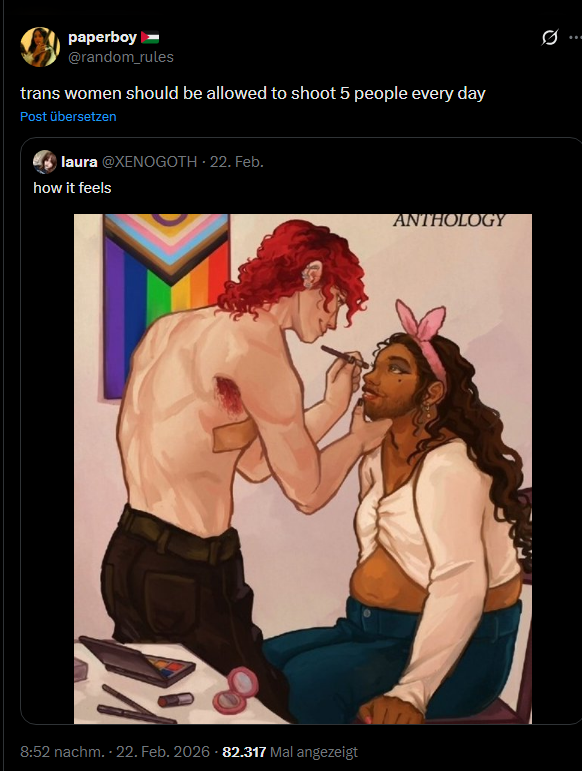 the kind of people we used to call tumblr have a regressive extremism fetish, they find something outside and othered and lean into it, whether it's to do with gender or race or disability or religion. the problem is that if they all do it then it stops being extreme in their circle, it stops being unique and special, so they have to go a step further. they make the extreme version of the extreme thing, and one way to do that is to make the counter intuitive version, the asexual sluts as it were. the image in the op is just that, not just a tranner, but a manly tranner. they like to play with what is exotic to them, they like to make it extreme, and then extreme again backwards, and if you don't like it then you're clearly just a bigot right? why shouldn't we make a minority of a minority the face of a group of people?