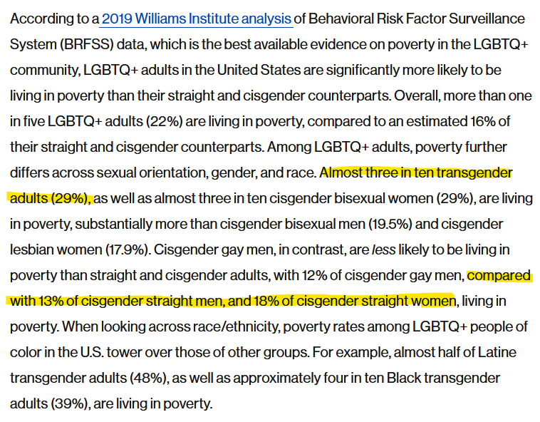 >>42768678non-white cisgender people are included in the "cisgender straight men" whom 13% are in poverty, you know that right? So black trans people are more oppressed than black cis people, and same thing for white people.
