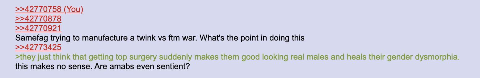>>42770758>>42770878>>42770921Samefag trying to manufacture a twink vs ftm war. What's the point in doing this >>42773425>they just think that getting top surgery suddenly makes them good looking real males and heals their gender dysmorphia.this makes no sense. Are amabs even sentient?