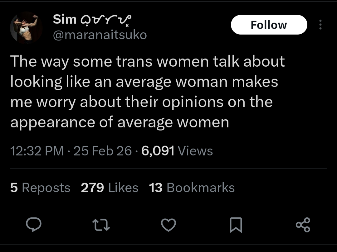 >>42779308because cis women don't also have extremely distorted senses of self-image and attractiveness. but it's only a problem when trans women do it