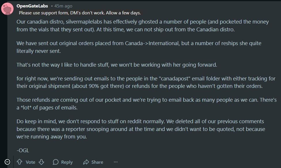 its hilarious how ogl kept saying it was canada post fault that canadian orders weren't being delivered until a month later she finally admits silvermaple exit scammed (see picrel). every time ogl fucks up: "muh post office"