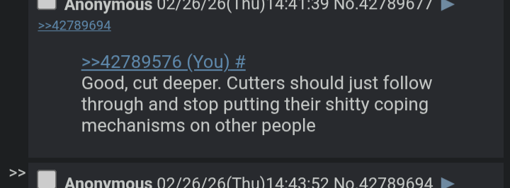 >>42792995> faggotI came. Thank you!Btw Self harm like suicide, is directly linked with harming others and homicide. Your propensity towards violence and levels of emotional instability are indistinguishable from 4chan staff. Thankfully my many years here have bred gut instincts to recognize fakers when I see them.
