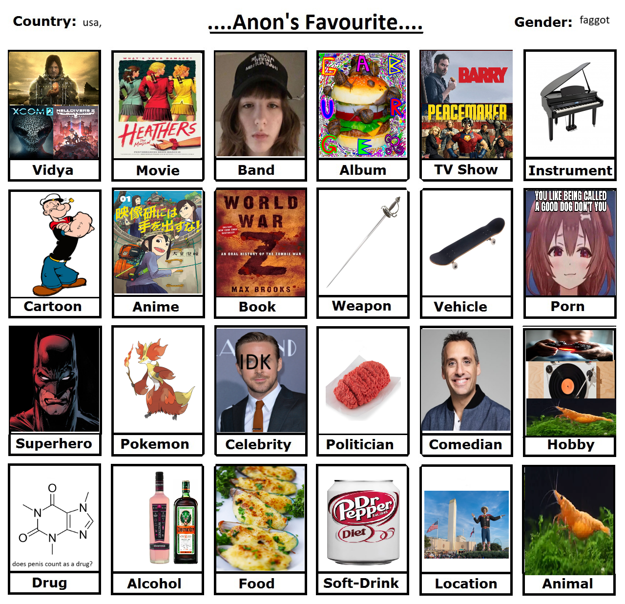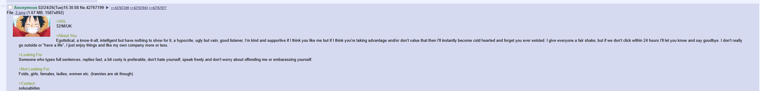 Boring weirdo who mostly enjoys solitude but desires some human contact now and again. I am (or was at one point) into video games, anime, history, music, films etc. and spent most of the last 15~ years wasting my life talking to fellow retards on 4chan. I put in effort and assume the best of people, I can be a piece of shit sometimes like anyone I suppose.