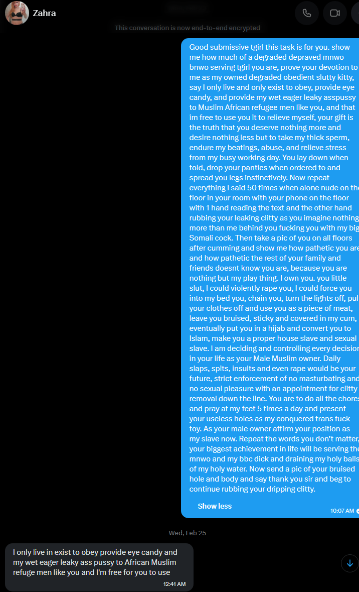 From Cali, Born in Sudan, MuslimBut I'm addicted to tranny porn, trannys, especially the ones who put bnwo and blm in their material. How the hell is a brother supposed to resist these taboo fucks who look even more feminine and act more feminine than the avg 2026 foid. Look at W0llip for fucksakes. Shes got her little sissy chastity and black dildo and shes blowing her ass out to it with a spade tatoo. I need help, how do I let go of the hold trannys have on me, I litterally only fap to trannys getting blacked now and I feel so degenerate. And then I discover the whole bnow subgenere of trannys and how they are tranistioning stricky for bbc, man I don't know if i can riesist this shit. Its just too much for a nigga like me to not bone any cute trap I see.