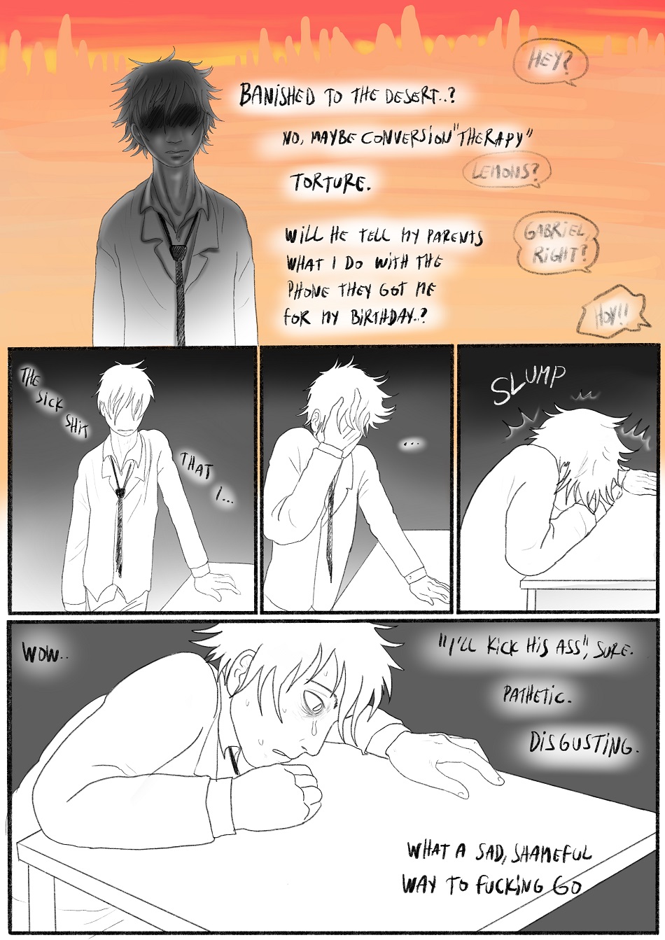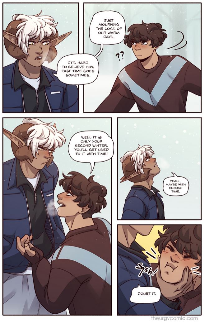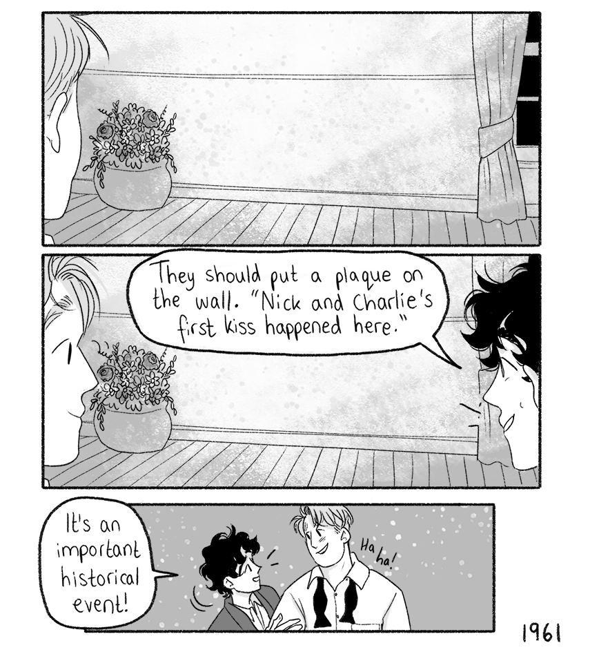 >>42956351>>42956438And even though it's SFW, the mains in Novae are at least 'together' by the 4th chapter (currently on it's 18th chapter). Ghost Junk Sickness has been going for about ten years as well, but it's more of a story-driven sci-fi comic. Aside from queer window-dressing sprinkled throughout, we only got this scene in June of last year (I still like this one a lot though).
