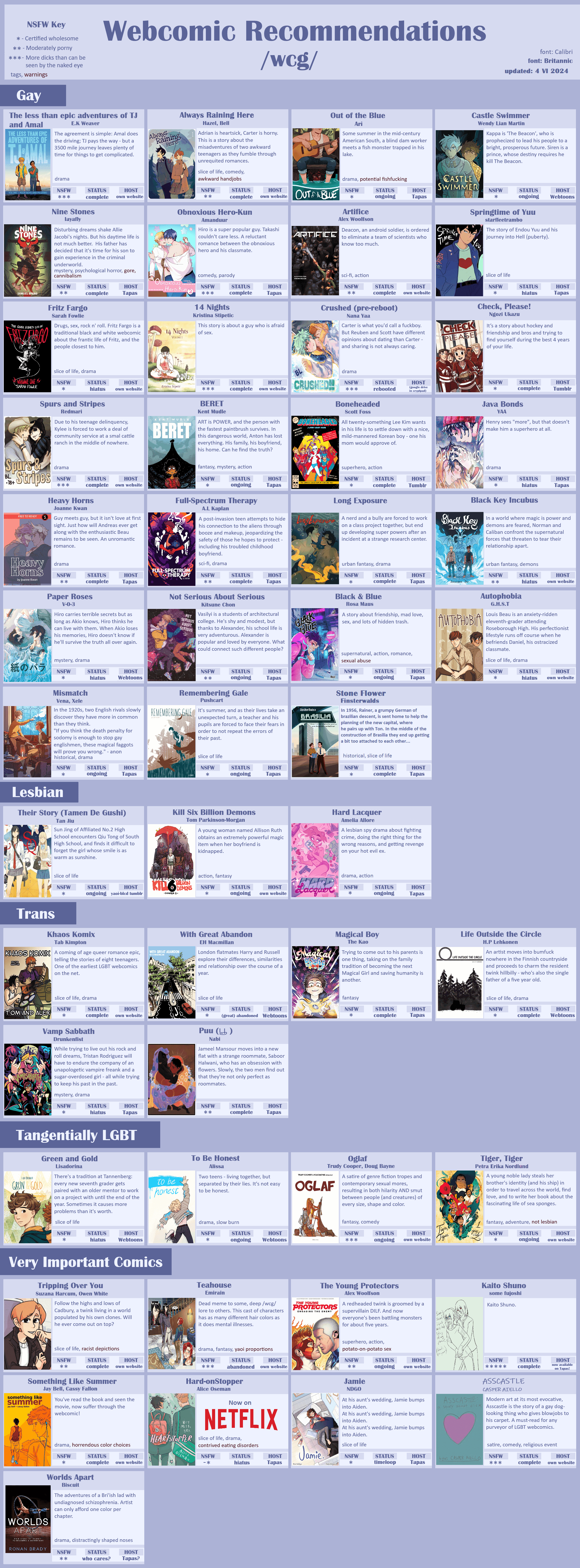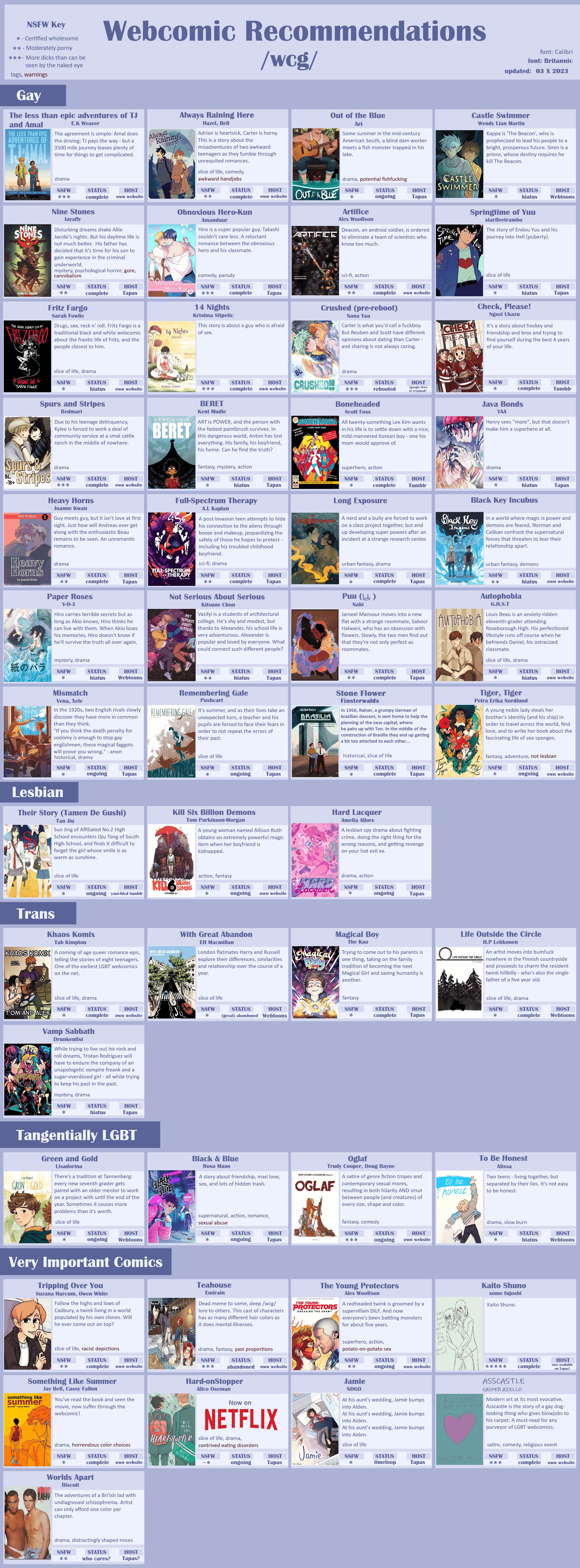 Did my first pass at updating the chart https://webcomicsgeneral.top/pmwiki.php?n=Lists.RecChart Mostly a clean up to begin up. Broken links and images fixed; tags, warnings and nsfw status updated. Work on the table should be more streamlined going forwardTomorrow Ill work on adding the comics we discussed recently (these mainly >>42956002 and a few others like Tiger Tiger, Strange+Wild and To be Honest) and maybe moving around the entries in the table (for starters Stone Flower being dead last is unnaceptable lol). Im considering moving the comics on hiatus (particularly the ones on multi year hiatus like Springtime of Yuu or Jaba Bonds) to the bottom but Im unsure about it, as some of those are iconic, like Fritz Fargo.After that Ill reconstruct the Trans and Bisexual tablesAnd after after that Ill work on the image version of the table