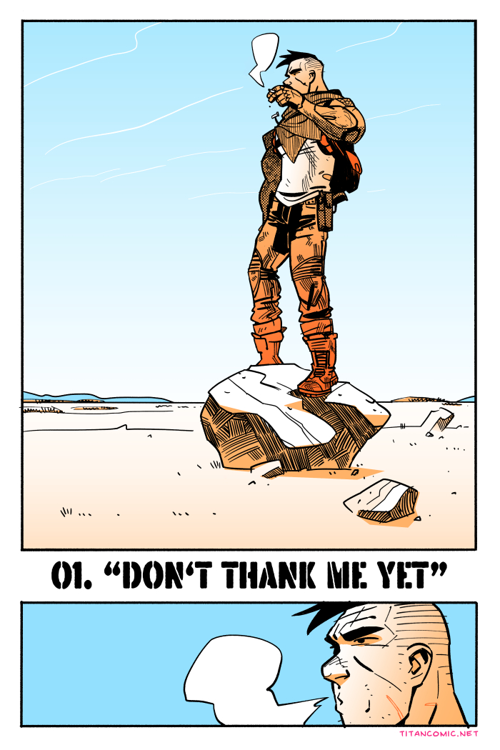 >Name: The Titan>Site: titancomic.net>Desc: Supersoldier mercenary and girlfailure are forced by circumstance and desperation to travel together across apocalyptically destroyed southern california, straight romance w trans male main character>NSFW: some nudity, nothing graphic>Days it updates: Mondays