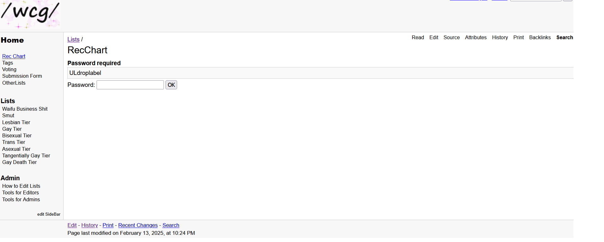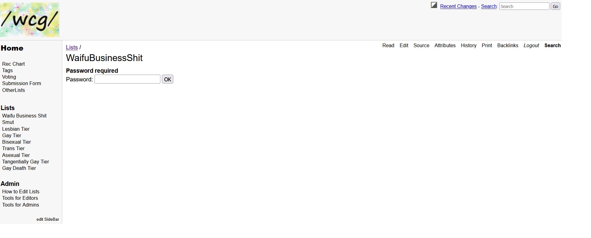 >>42958257I hadn't realized that the lists weren't publicly editable, it has been resolved. Please note that other areas of the wiki may still be read-only, or need a password to view, but all the rec lists should now be editable without a password.