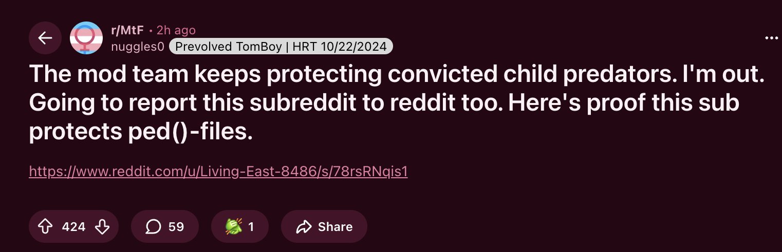 A Reddit mod who moderated three large trans subreddits just nuked her account. Turns out that she was a convicted child sex offender. And the r/MtF admin team knew of it but defended her.https://reduxx.info/transgender-reddit-moderator-deletes-account-after-being-exposed-as-registered-child-sex-offender/