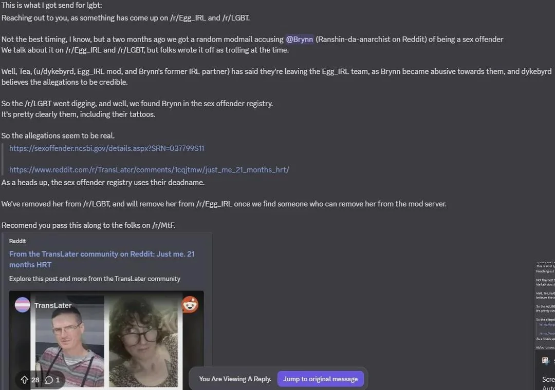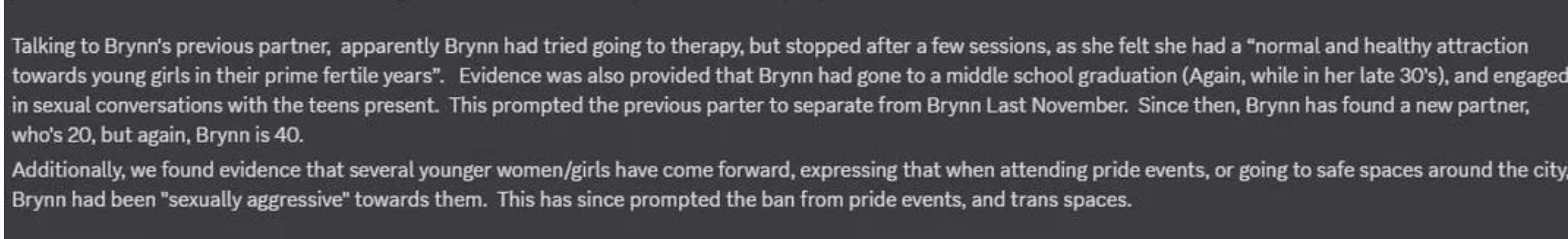 >>42955460Hi, Bri here (the former mod you are all obsessed with and trying to destroy). I am deeply sorry for how negatively this scandal will impact the wider trans community, but also want to say a LOT of these fucking accusations are being blown out of proportion or just completely fabricated. First of all, many of the chats that are circulating were stupid roleplays, particularly the ones with Shaelin who was 16 (the AOC in her state). Second, the “conviction” was a plea deal I took because the alternative was 5 DAMN YEARS in prison minimum. Many people accept plea deals without being guilty of anything, just to avoid prison, or worse. Lastly, the doxing and harassment is ILLEGAL, and has been reported to the police who will be collecting IPs from r/MTF and the Kiwifarms to track down the people responsible. You have been warned!