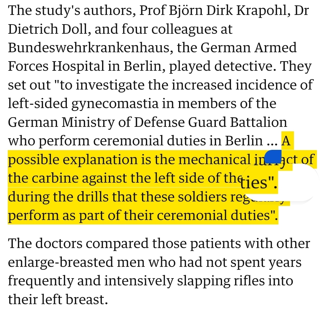 >A possible explanation is the mechanical impact of the carbine against the left side of the body during the drills that these soldiers regularly perform as part of their ceremonial duties