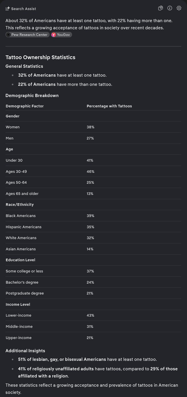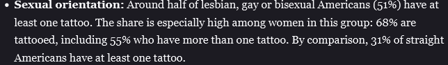 >>43017634>That somewhat contradicts the overall "people are becoming more accepting of tattoos" narrative.Someone who is 20 has only had a couple of years where they can get a tattoo, you would have to compare what percentage of people born in x year have tattoos by x age