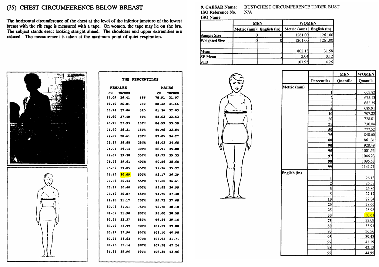>>42983841If you're anywhere near average male height (with your weight being 190 lbs I hope you're not a shorty) then 32-33" underbust is probably at or slightly below female average for your height anyway. Remember that average female underbust at average female height is 30-31" in both ANSUR and CAESAR.
