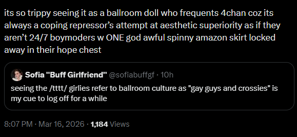 >>42967979>you know i never thought cunty ballroom divas serving fishy realness could be on /lgbt/. i guess that was prejudiced of metheyre not real, theyre entirely a neo-jeep aesthetic fetishisation of actual ball culture, because jeeps have no culture and need to steal it from others.cunty doll culture in 2026 is about as real as those websites that pretend to be mid 2000s era 4chan posters