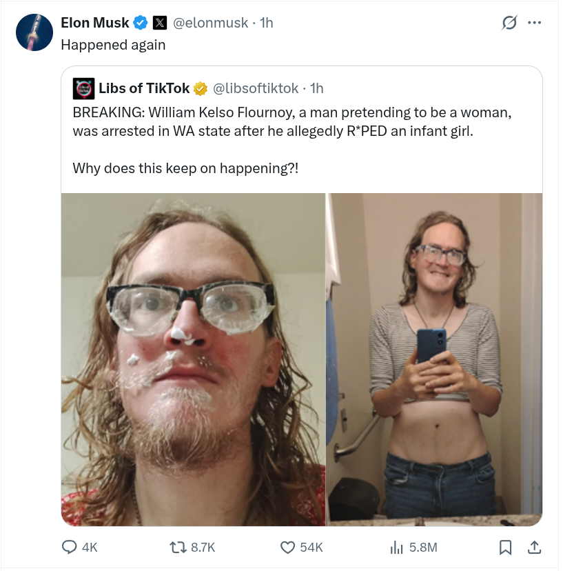 >>42972401 Elon didn’t seem too worried about what was going on at Epstein’s island and even asked to go to special parties. His concern is only because it involves a transgender person now. It’s horrible what happened and I hope this criminal is punished. But I can still point out the hypocrisy.