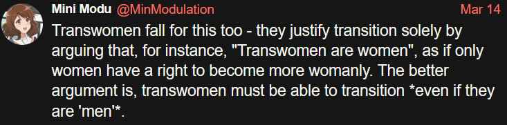 >>42979752That is to say that I agree with the argument but the applied example is a little shaky in its applicability (it is kinda strawman-y as >>42979743 mentions) and implications (paraphrasing, "transwomen [sic]* use a faulty argument predicating them as women and a more solid one positing them as men is valid")*not necessarily docking for use of "transwomen" but certainly taking note of it