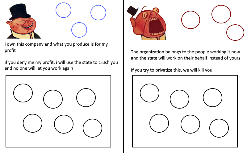 >>42983114it means a private entity such as a sole proprietor or a private corporation no longer has legal ownership over thingsit means organizing ownership in a way that the people, the workers, who utilize it and depend on it to complete their labor have ownership and responsibility for ityou think of a unionized factory, something i have first hand experience with, and the functions of that factoryaround 800 workers on the floor operating machinery, completing tasks, no owner in sightthe owner however has private ownership over the plant, he has this because he utilized his capital to acquire it and the state as it stands compels everyone to agree with this idea and will utilize violence against people who disagreethose 800 workers take part in socialized labor, fragmented labor to complete wider tasks, but have no stake in the products being made, no stake in the machinery they use, etc.in a workers state, the state no longer believes and upholds private ownership but instead may control the factory itself or the union is responsible for the factory and works in tandem with state functionaries to ensure it meets its goalsin doing this, we haven't actually disturbed the work, we've just challenged the assumption of innate right to ownership that the private entity held before, and implemented socialized control to the workers without disrupting the underlying function and operation of the workif labor is to be socialized, the collective products of that labor should not be privatized and sold off for the benefit of the sole proprietor, it should be the fruits of the laborer beneath a state that focuses on their well-being, not the arbitrary upholding private property rights