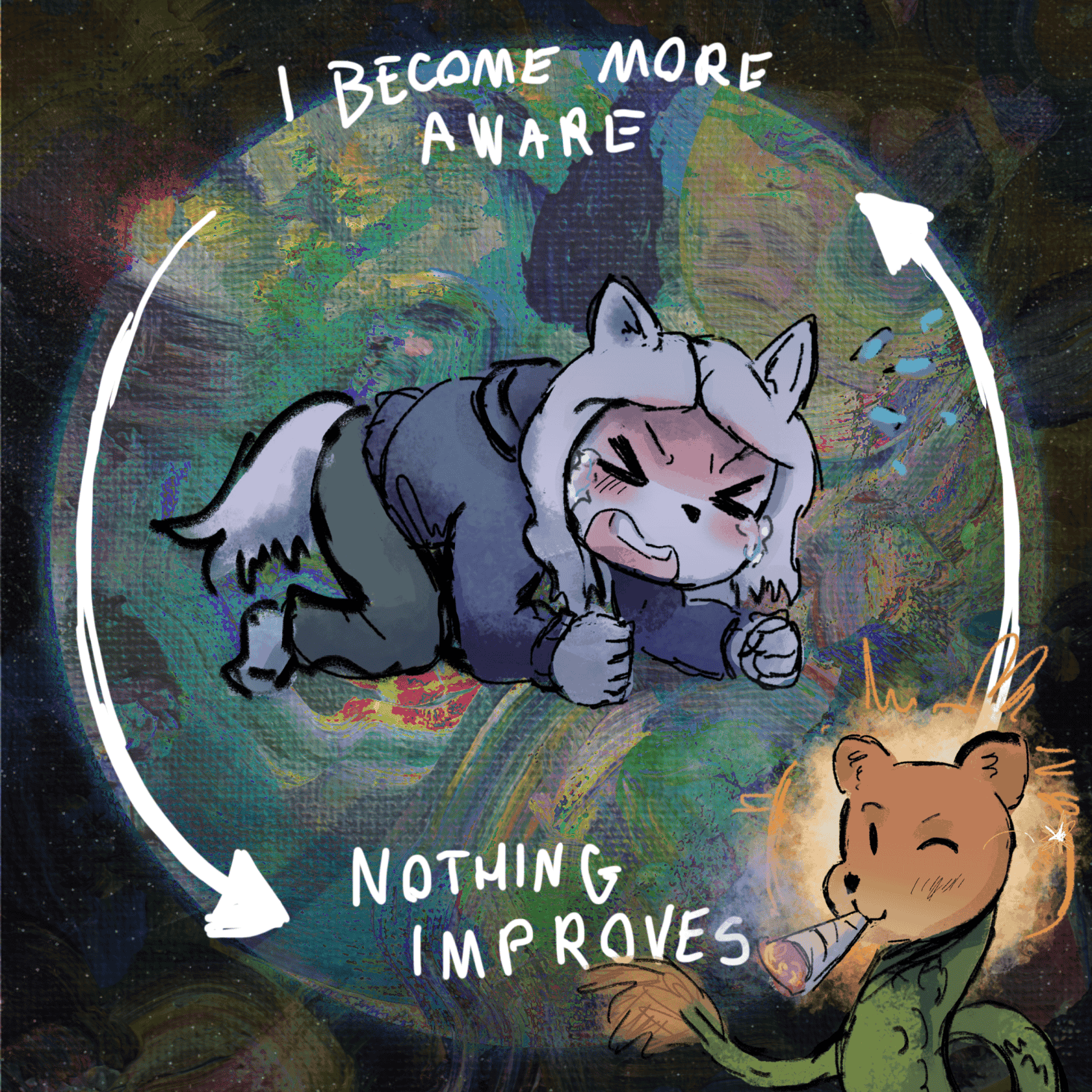 completely disillusioned that the future has any sort of life worth living, cannot possibly motivate myself to work hard to create a future for myself that will inevitably be invalidated by war, poverty and environmental collapse