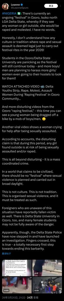 honor killings are a well documented phenomenon. "rape festivals" just came out of nowhere like 3 days ago and all of a sudden it's a tradition of igbo state or whatever. put on your critical thinking cap nonny, what's more likely: it's made up ragebait, or the entire world just suddenly found out about a "rape festival" in a country of like 20 million people