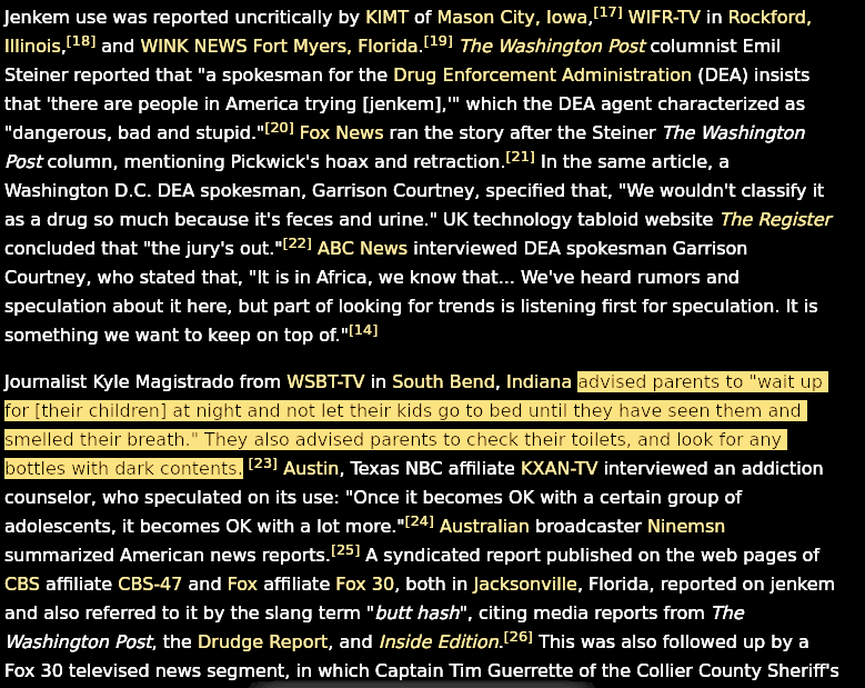 the lurking threat of jenkem in every toilet was an unquestioned fact in the mid 2000s reported by all manner of respectable news agencies, and then one day everyone sort of collectively pretended it was never a thing