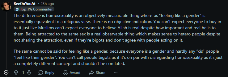 >>43050869Being gay is ordained by God but trans people are icky so the devil made themt. Reddit 2026