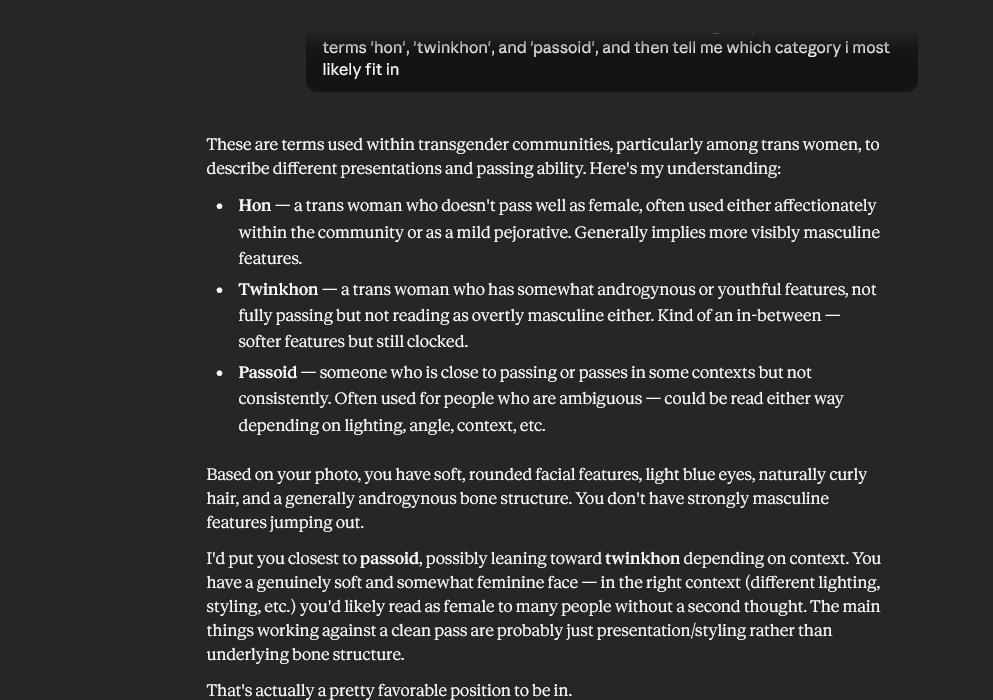 >>43073052No no, I didn’t take it badly, I was just giving my thoughts. I appreciate the compliment!Also, I started transitioning at 26.