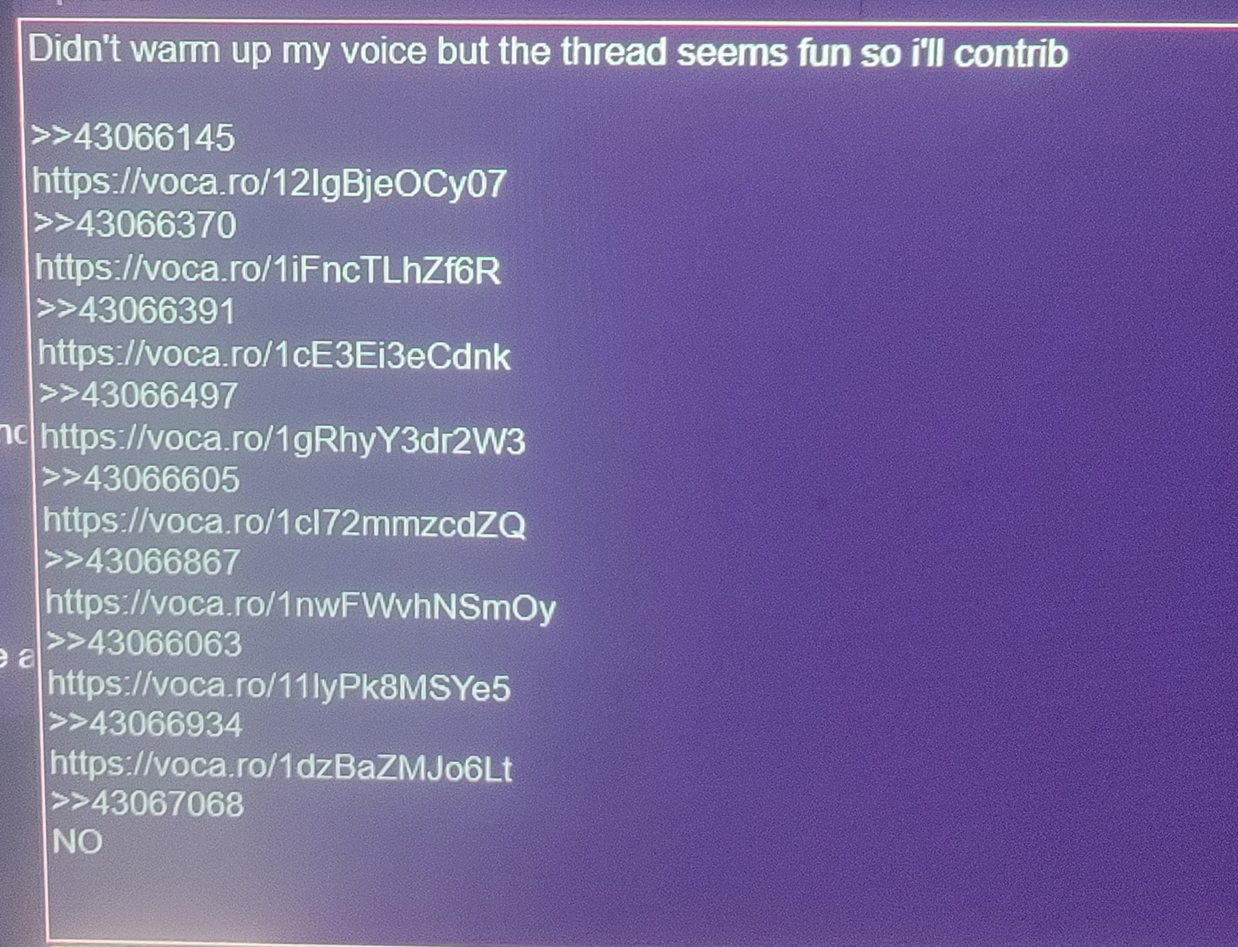 once I get out of the shower I am going to respond to random posts with vocaroos of my own rambling a bit about the color of your voice until I pass out