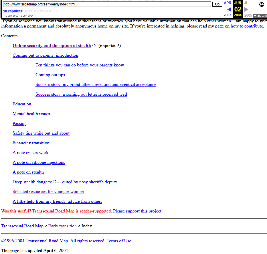 I will say that while of course it was much much harder to access info about trans people or representation which would make anyone feel ok about being trans, there were guides for DIY in the 00s.TS Roadmap had an entire section about getting a PO box and ordering HRT on the grey market for teens.t. came out in 2004