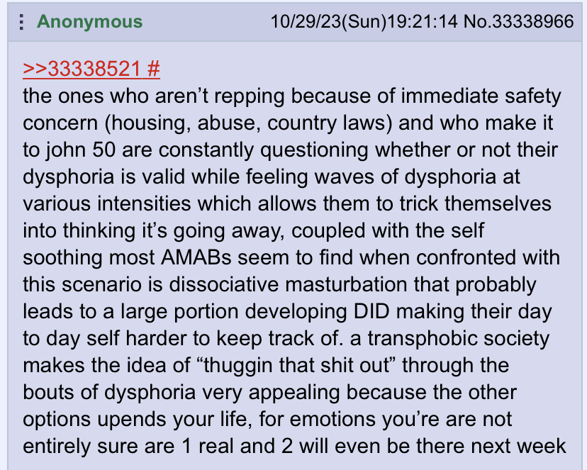 it can even turn into tocd whitch is even worse than normal troon dysphoria. ones getting it are subby and were deeply repressed but sonething huge made them question. for me it took both dysphoriabfrom masculinizing and conjuring some eunuch society copes and all day half night daydreams if living as a woman. oh my sweet sweet daydreams... let the dream come true. fuck i want to be a woman sooo badly. sigh...
