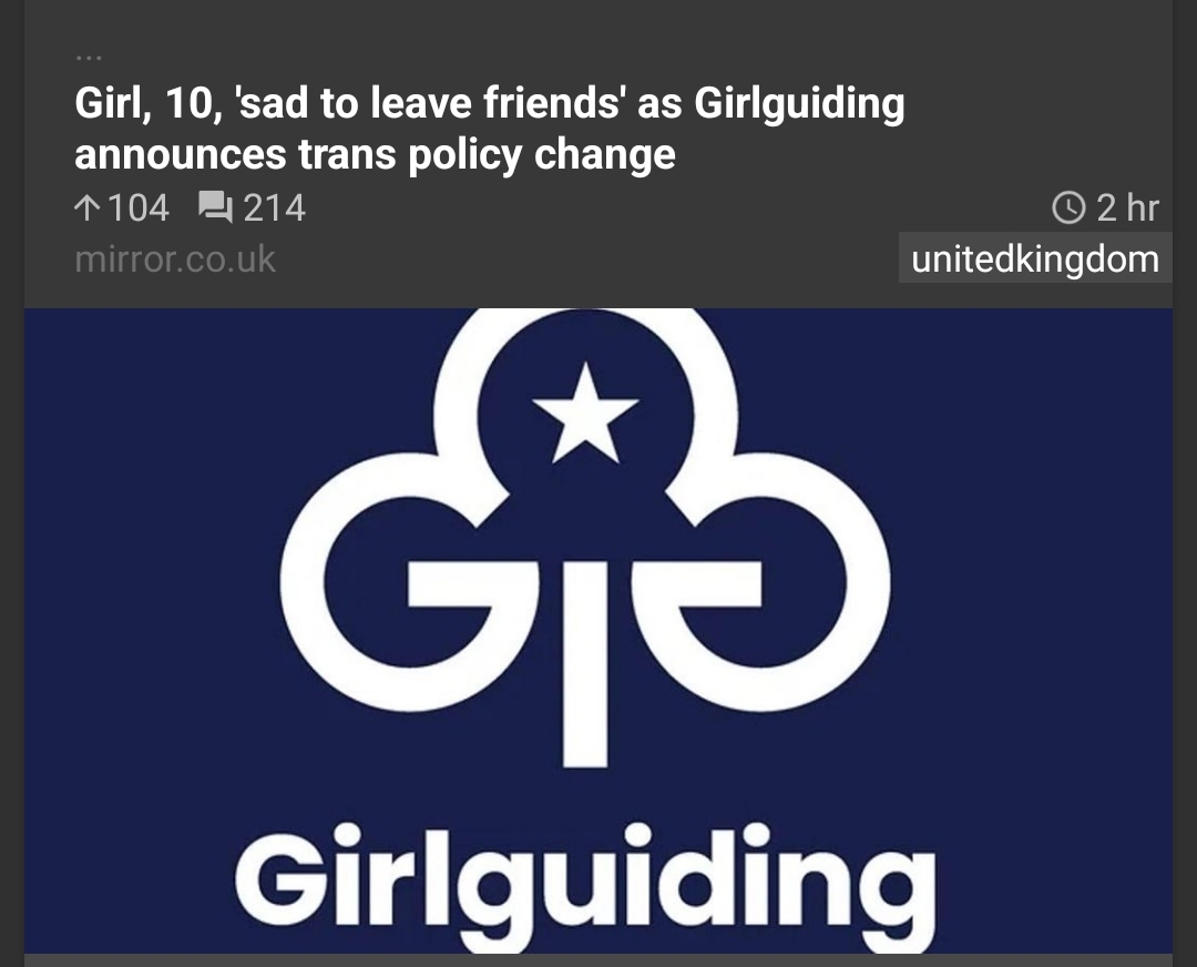10 year old girl forced to leave her friends because of transphobic lawshttps://www.reddit.com/r/unitedkingdom/comments/1s5ynwl/girl_10_sad_to_leave_friends_as_girlguiding
