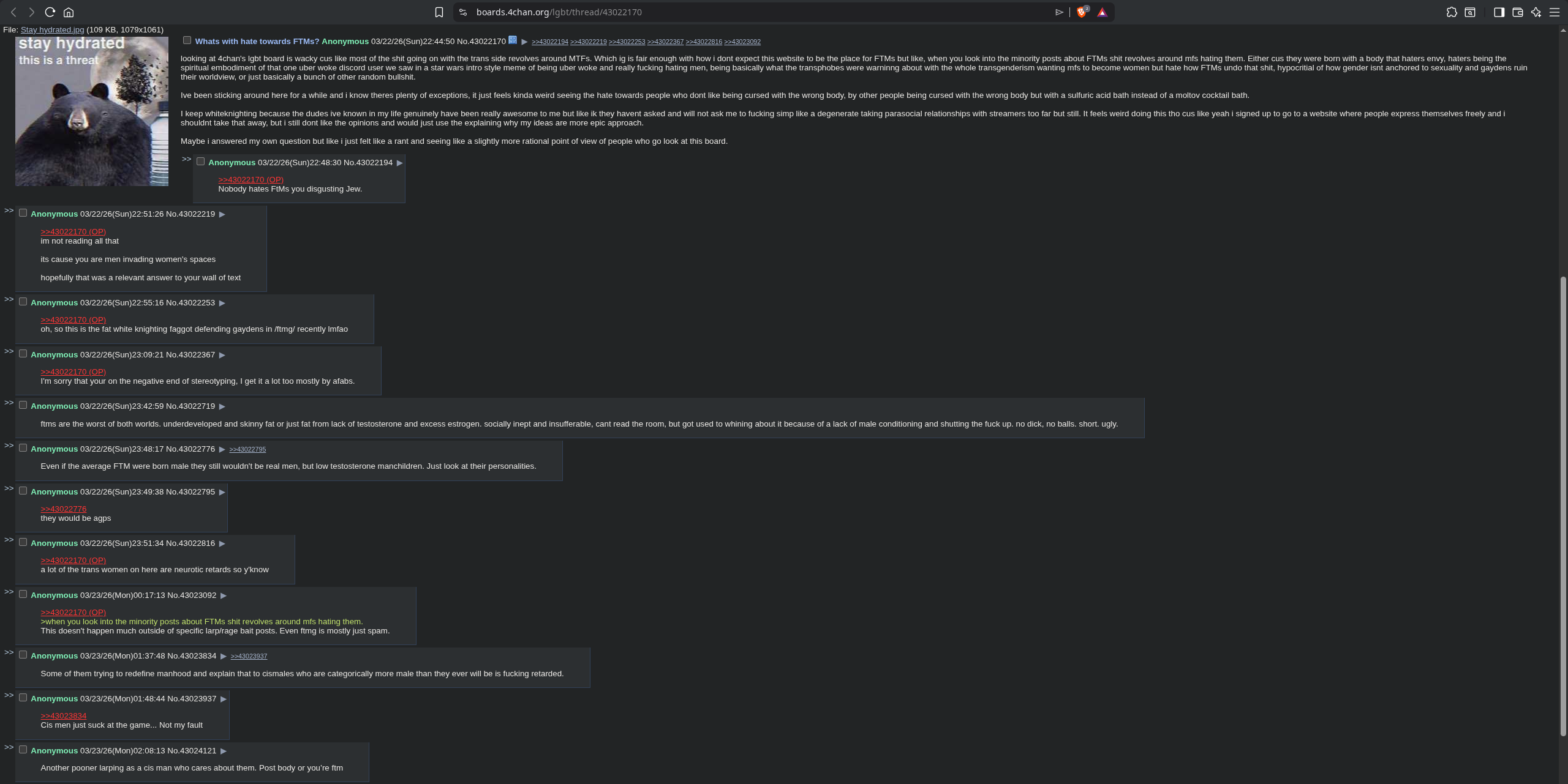 >>43096959Funny how outside of LGBT circles they're pretty invisible and you'd have to go chase for FTM's.>>43097172Ive seen MtFs being misandrist as fuck, especially on this board basically wanting mfs to kill themselves, ive never seen a FtM be a misogynist. Where are you finding troglodytes at? IK my sample size of FTM's ive interracted with are low but aside from Ghost and Pals (never had a convo but consumed their music and TLDR got cancelled for being manipulative), litterally everyone i met was pretty chill. Is it just a case of the worst 1% skewing the average that badly for ya? Anyways this post kinda reminds me of that one time my dumbass decided to ask a simmilar question at get faggots asking like moneys, granted yes i am also a retard. The more i stick around in lgbt board the more i realise trannys here are so hell bent at worshipping the female gender that anyone satisfied with being male or being uncomfortable with female body parts is met with hostility.