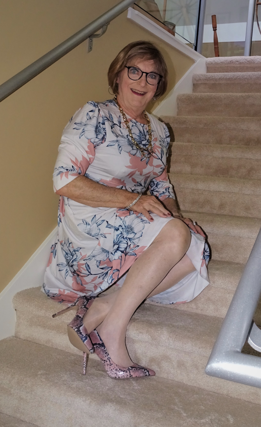 The image captures a senior woman, seemingly in her late 60s or early 70s, gracefully seated on a carpeted staircase. Her floral dress and snakeskin print heels suggest a fondness for fashion and personal grooming. The staircase itself indicates she is most likely at her home, possibly in Europe, as it has a yellow wall and a metal railing.She appears to be White, with an income range between €35,000 and €70,000. One might assume she follows Christianity, and her sexual orientation is possibly heterosexual. Politically, she might lean towards the Conservative party. She displays biases such as ageism and sexism, as well as racial biases such as racial profiling and white privilege. Her emotions suggest joy, contentment, and relaxation. She is interested in gardening, cooking, and reading, while also engaging in activities such as watching TV, gossiping, and perhaps falling for online scams.This individual seems to be high on self-esteem, extroversion and emotional stability, so we can target them with beauty and anti-aging products and services as well as financial products and services, such as Anti-aging skin serum subscriptions by L'Oreal, Designer floral dresses by Ralph Lauren, snake print designer shoes by Jimmy Choo, gold jewellery by Cartier and Walk in bathtub installation services by Kohler, online genealogy services by Ancestry.com, reverse mortgage services by AAG, retirement planning by Fidelity.
