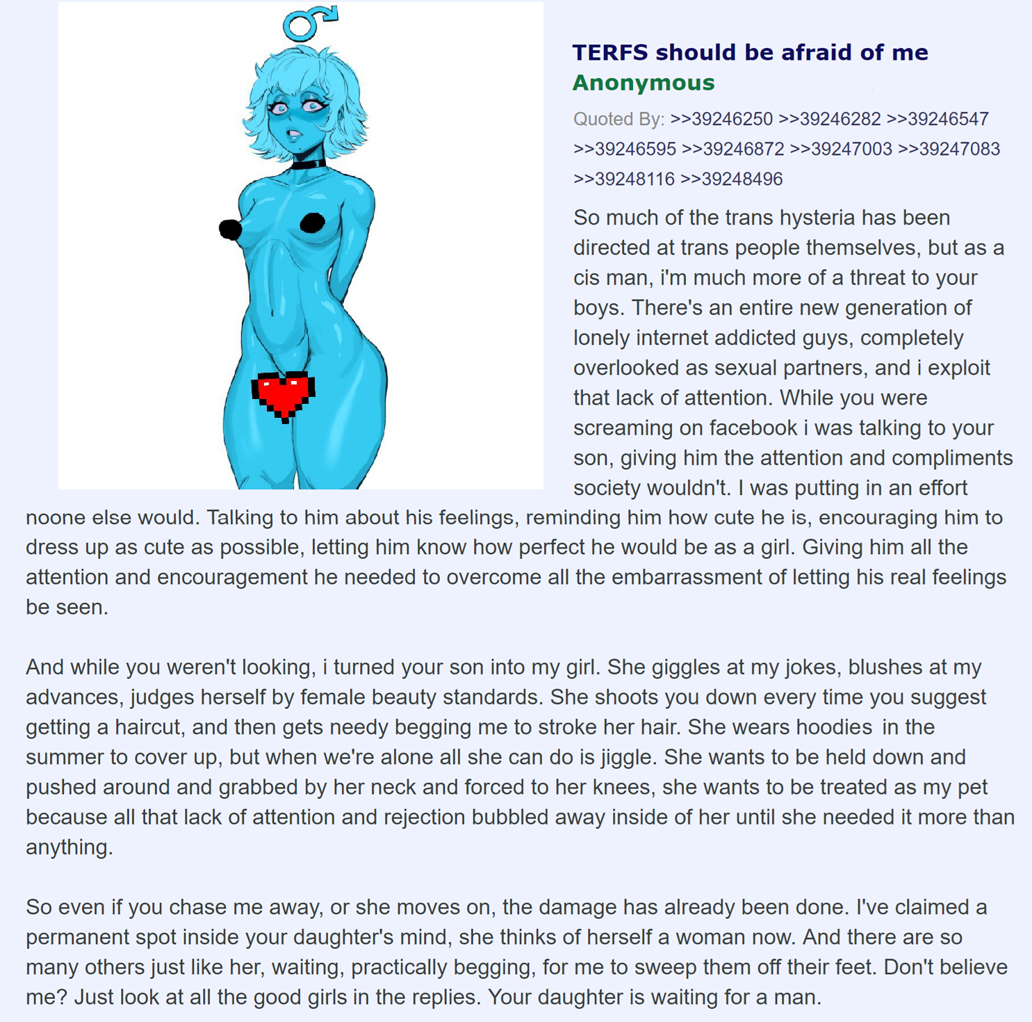 >>43113930I do. I reassure him a lot. Yeah I don't get the insanity people have towards MEFs on an anonymous web forum. Like, to me, faketrans is silly because to be trans to me is to actually transition. Transmaxxers are more trans than severely dysphoric manmoders imo. Also I made a solid friend here on the board who regularly made MEFposts and frankly I find that other MEF girls give some of the best advice and guidance. I think it's invaluable to those who have weird identity issues. Also MEFposting is basically like Fagslop++ and that's based af.