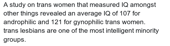 >>43108062Well to be fair the sample is biased here because you obviously can only study out trans people. All the truly stupid trans people became bitter repper MAGA chuds because they can't imagine ever going against the gender hivemind.