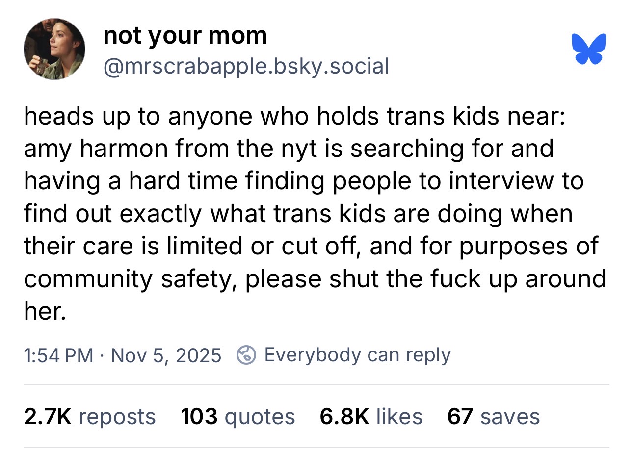 based on her wiki, she writes pro black, pro neurodivergence, antiwhite, and focuses on tech and science (unclear if in favor or against). she is going to spin this article as DIY being irresponsible and that they need to crack down on it for everyone to prevent underage people from accessing it. people on the reddit thread already found transphobic links and NYT is transphobic too.