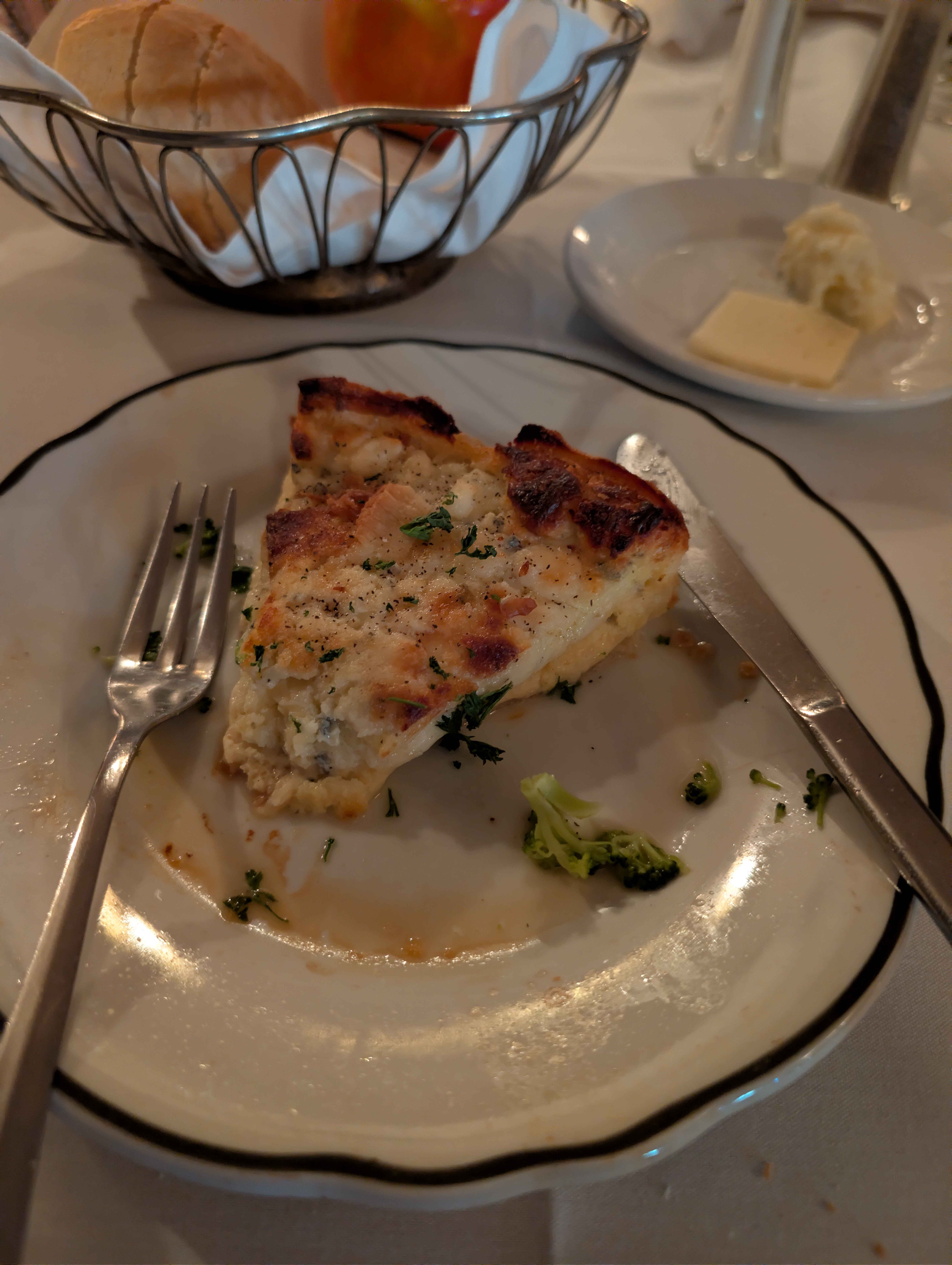 Saturday p2>Stop back at my place to get changed into some nice clothes>Formal black dress + black underskirt + heels combo>The Boy wears a sweater polo thing>Heightmog him so hard>6'0" in heels vs 5'5" on a good day>Don't mind at all>Actually kinda adore being this much taller than him>Drive back to downtown, walk nearly half a mile in heels from the parking garage to the restaurant >Fancy atmosphere, but not too expensive (Dinner for two is like $60-70)>Eaten there once before, I think, but not sure>Various other couples there, mostly older ones, maybe one around our age>Share a soup that was insanely>He gets a pork cutlet>I get a quiche au roquefort (picrel)>He walks me to the theater>While he's dropping off his leftovers in the car, I buy us tickets from the box office>No one there recognizes me (I stopped working there just before starting HRT and had only attended once or twice since)>Box office lady (<3 u) asks me if I've been here before>"Oh I used to work here">Feel safe enough to out myself to her since we worked together for three years>She's shocked but actually seems really excited and gives me half off on the tickets (employee discount scheme on tickets is weird but she had some of her 50% off ones remaining)>"Who are you seeing the show with?">"...my boyfriend..." (felt less awkward than just saying my date)>She congratulates me and I get out of her hair while waiting for The Boy to get back>We get drinks>Bartender tells me I really need to update my ID (I do but I'm still wormy and mostly see myself as a boy so haven't yet)>Enjoy the show immensely>Theater kid sleeper agent activation code embedded in the opening number has me mouthing all of the lyrics and dancing in my seat to all of the songs >Head home afterwards>Formally asks me to be his girlfriend (I'm a boy but y'know)>Say yes>Cuddles and kisses a lot before going to bed