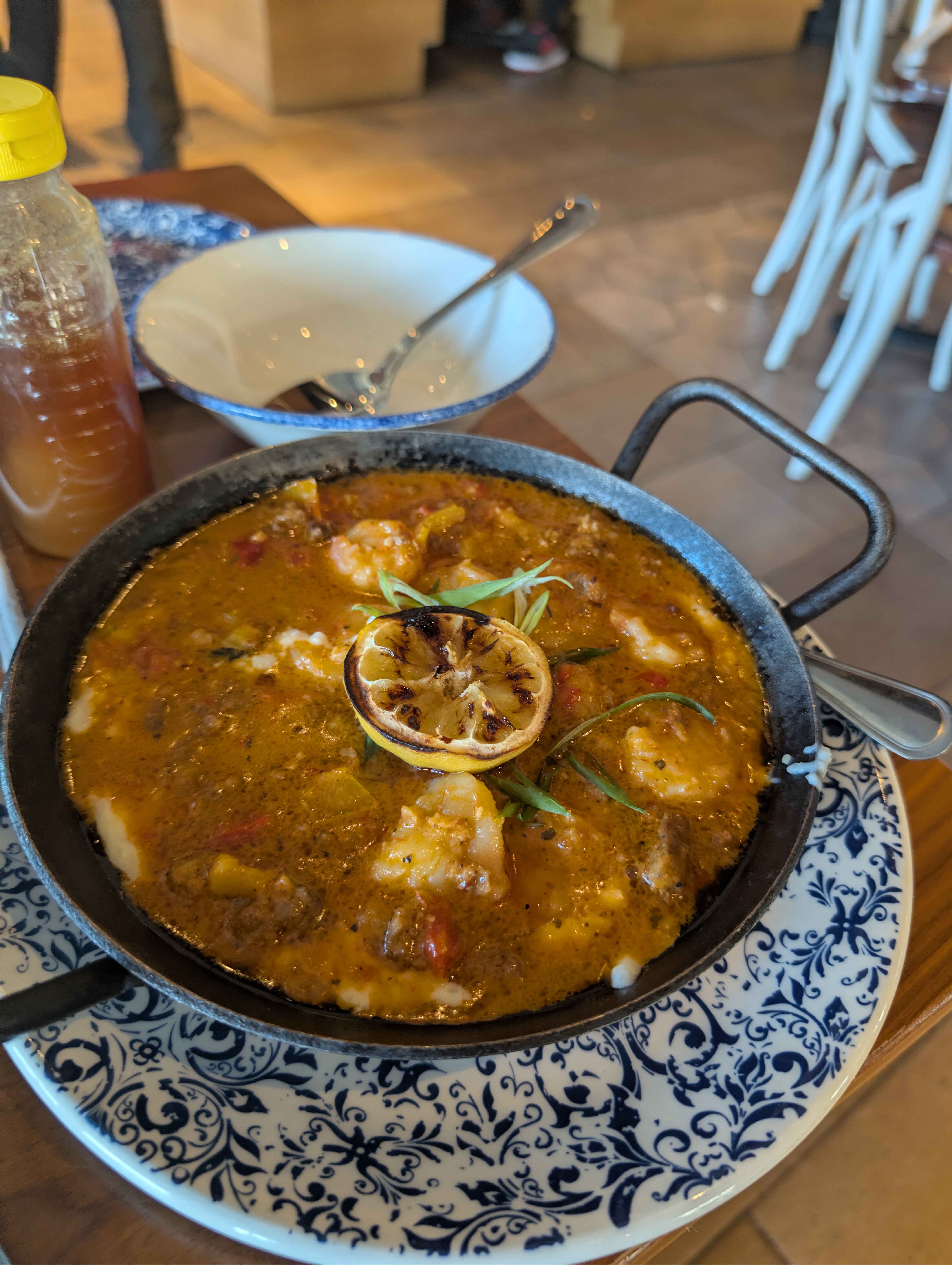 Sunday>Relaxed day>Head to the shopping district of a bordering city for brunch>Need to introduce this Yankee boy to proper southern cuisine>Restaurant is absolutely packed, about a 1 hour wait>Wait it out by going to the Lego store>Buy each other some Lego botanicals >Brunch time!>Share a mimosa, fried okra, biscuits + jam, and shrimp & grits (picrel)>Best thing we ate over the entire weekend imo>Head to a bookstore >Still haven't read Whipping Girl so look for that but they don't have it>Instead grab A Vindication of the Rights of Woman by Mary Wollstonecraft while he grabs one of The Expanse books>Go to Ikea afterwards since I need a lamp for my room and it's like a fun little shopping date thing>End up buying another blahaj (was gonna be for him but he felt like it was stolen valor)>Now I have a third shark>Go to a nearby state park for a short hike>Weather is really nice so we spend a couple hours there before heading back to my place>Leftovers for dinner>Cuddle a lot>Try and initiate some kind of sexual activity but I'm painfully shy in ways I have never been before >I'm technically not a virgin but basically am >Like I technically had sex once with a guy before starting HRT but it was really bad and I didn't like it and most sexual contact with anyone after that mostly left me a crying anxious mess>I was able to give one girl a blowjob but honestly after that I became more anxious and fearful >Not actually afraid this time, just really shy and embarrassed >Literally hiding my face with my hands as he's playing with my boobs>Also he is a wet kisser>Like his kisses are slobbery af>However!>He did improve at kissing over the course of the weekend