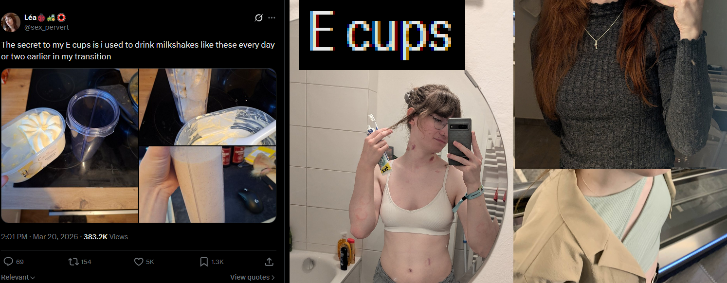 >>43122378Maybe E cups is her nickname for the milkshakes. I know a lot of TGirls get turned on by making snacks laced with estrogen (E-Brownies filled with 'blue sprinkles' are a huge reddit meme even though the heat reduces their effectiveness a lot)
