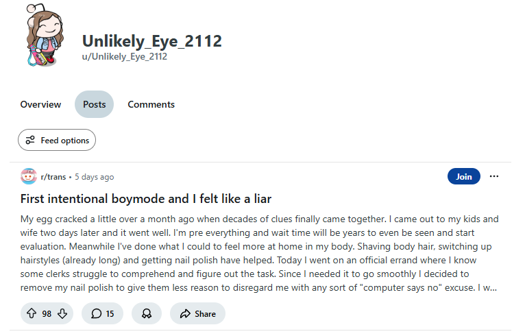 >>43115562I trooned out at 35. I'm turning 40 soon. I don't have any kids, thankfully. Personally, shaving my body hair especially my arms was a big deal to me I spent my whole life thinking I can't do that kind of thing because I'm supposed to be a guy. Finally keeping them smooth was a big deal, I guess zoomers wouldn't understand. Nail Polish is also another very visible thing and I can see why it was a big deal to her as well. When I was a teenager, I put on black nail polish because I knew I could pass it off as just a goth thing. Now I can wear my cute bright pink nails and feel good about it. I don't have to have an excuse for doing the things I like, I can just be me.