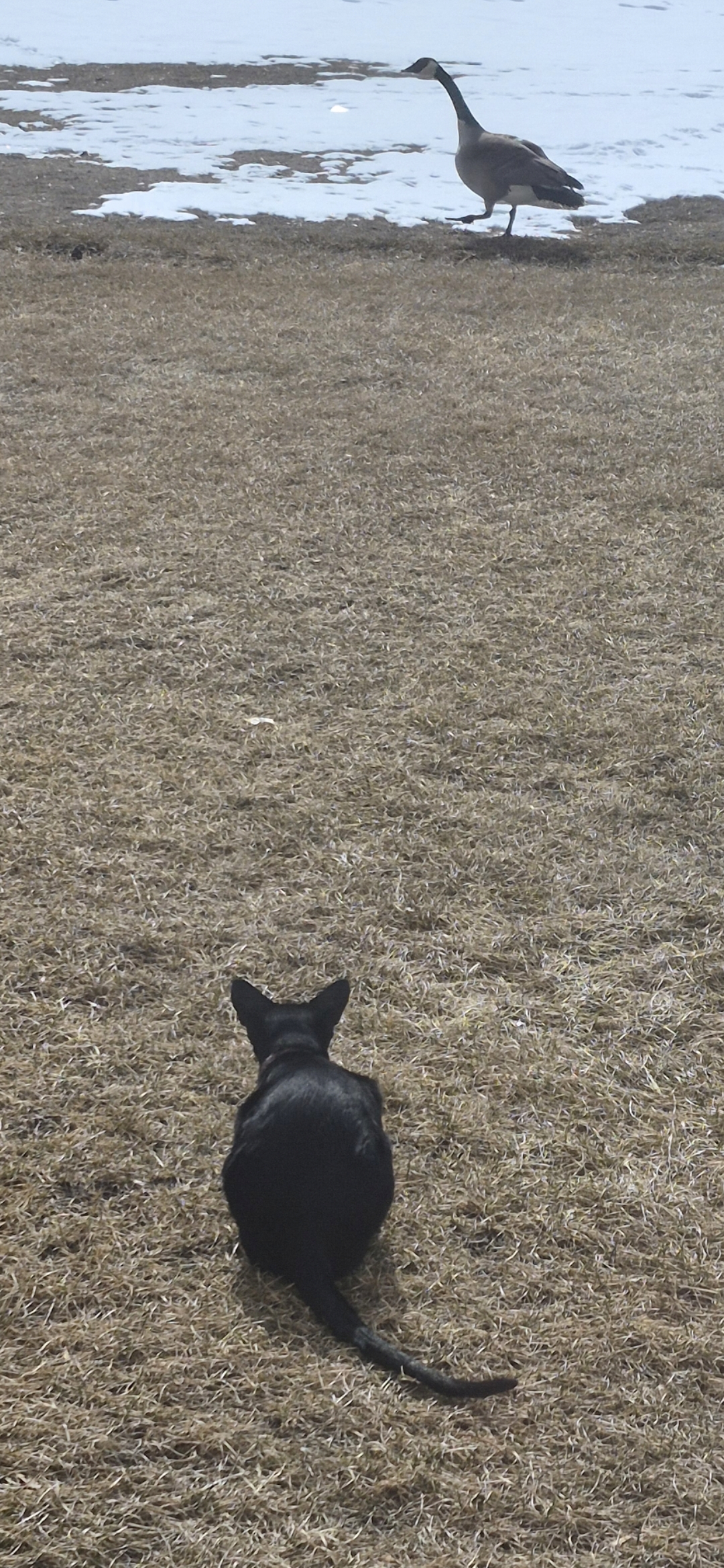 My cat is squaring off against a goose she keeps running at him and making him honk and fly away then he flies back and starts trying to intimidate her but she wont faulter
