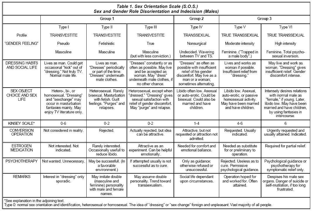 Benjamin's scale, while I have a lot of respect for him because he was not a gatekeeper like people seem to think he was, is inadequate based on what we now understand about the brain, and the term "true transsexual" is kind of a misnomer the same way "true spider" is a misnomer. Non-true spiders are still spiders. Non-true transsexuals are still transsexuals. People are garbage at language and it creates a lot of retarded misunderstandings. Better to avoid this and switch to a numerical scale like the Kinsey scale, and to add more axes than just one while we're at it to validate and record nonbinary presentations of transsexualism like feeling 100% binary transgender but feeling severe dysphoria requiring surgical treatment in only one of your primary sex characteristics so your transition would be completed once your body reached a more nonbinary state than a fully binary one. As well as accommodate the opposite where nonbinary individuals seek a 100% binary medical transition despite their social identity. The scale could be a range of "severity" of feminization or masculinization of each body part in regards to the brain's perception. Plus one or two for relational gender identity perception -maybe one from man to woman with nb being in between, and one from agender to very strong identification with a specific gender. If we had to, we could throw in a "gender role conformity" but I really wish people would stop conflating that with any form of transgenderism because you can be 100% cisgender and cissexual and even heterosexual and still be gender nonconforming, and besides that those roles are socially constructed anyway. Famous case being women now wear pants and it's not considered gendered anymore.