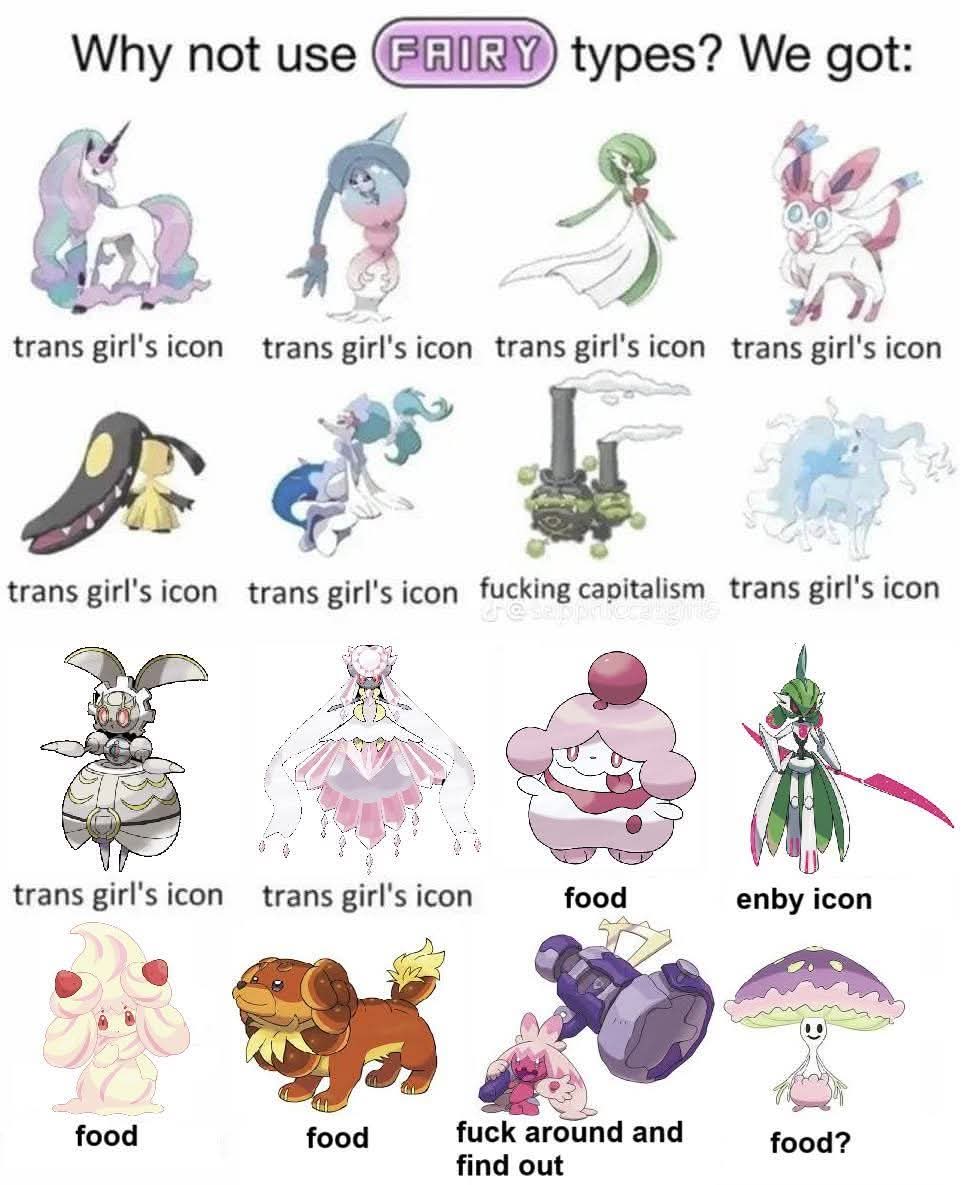 >>43137018Dark type is the FTM type. Obstagoon, Zoroark, Umbreon, Houndoom, Bisharp, Skuntank for my stinky boys out there...FTMs are naturally edgy. It's also the perfect contrast with MTFs being fairy type.