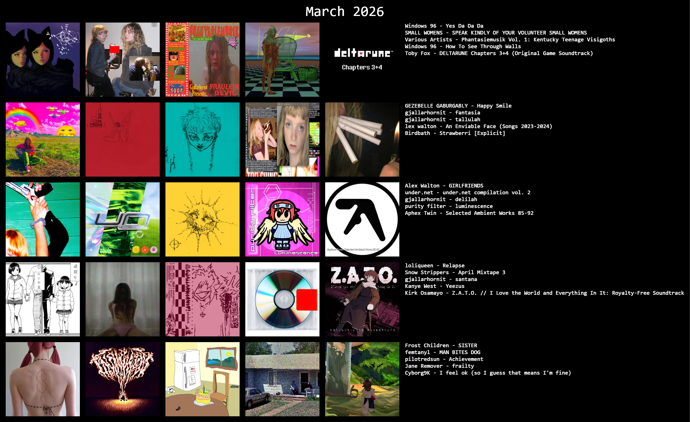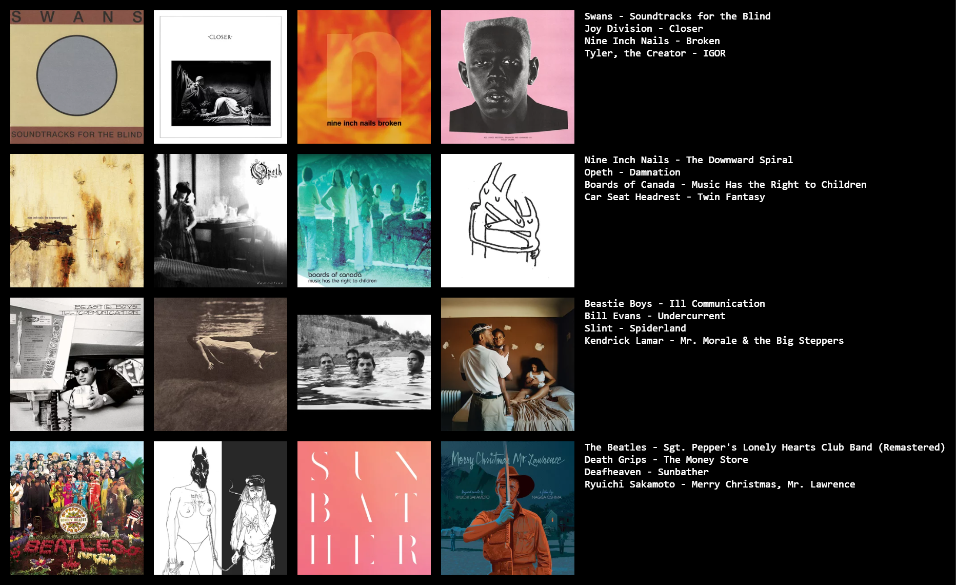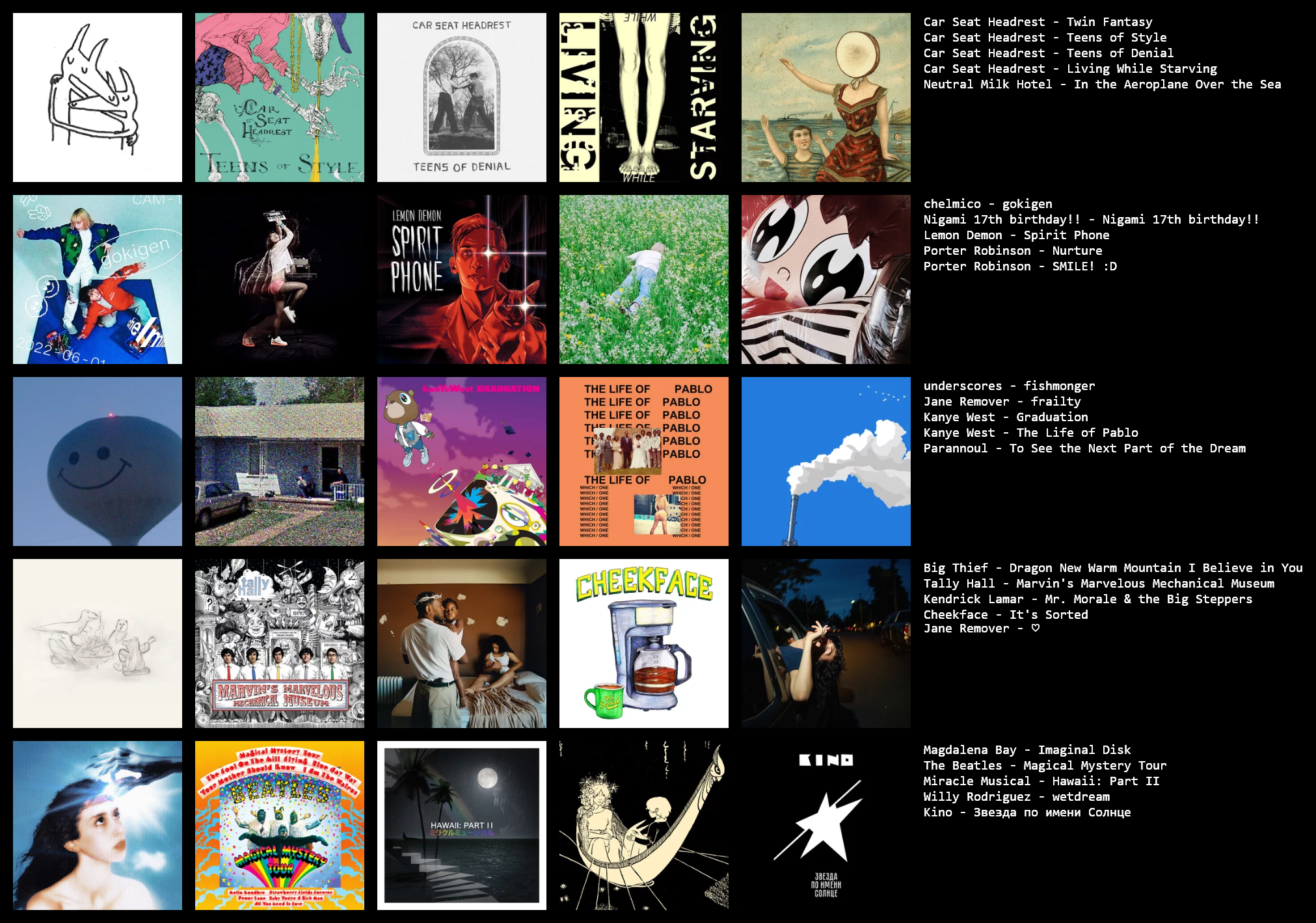 >looking foralbum recs: instrumental hip hop, idm, downtempo, electronic, ambient, abstract hip hop, experimental hip hop, nu jazz, boom bap, indietronica, conscious hip hop>not looking forvc, servers, groups, any people without some reference to know which albums you have already heard/liked (spotify, last.fm, rym, topster, etc.)>discordrem.lin>>43146305+aphex twin, kanye west, femtanyl, pilotredsun, jane remover
